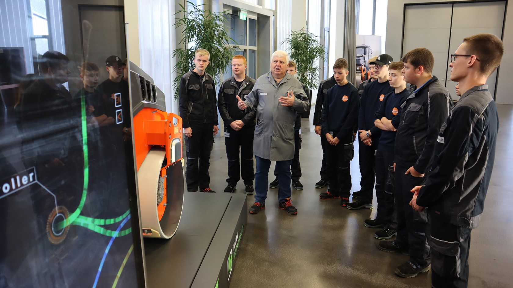 Ausbildungsleiter Josef Dill erklärt den neuen Auszubildenden Funktionsweise und Vorteile der batterie-elektrischen Tandemwalzen.