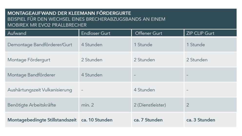 Für unterschiedliche Anforderungen bietet Kleemann drei verschiedene Fördergurt-Systeme an, die sich hauptsächlich in der Montage sowie Demontage unterscheiden.