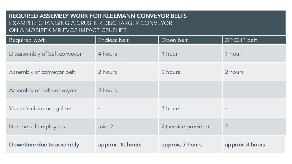 Plant downtimes mean production loss as fixed costs continue to accrue. With the ZIP CLIP solution from Kleemann, users can fit the spare belt quickly and efficiently. The belt is closed with a zip fastener. Work can continue directly after assembly – without time-consuming removal of the belt unit as with the endless belts and without an external service provider and curing time as with the open belts.