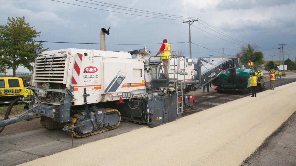 Dunn also opted to use the 3800 CR and the environmentally- friendly cold recycling technology for the recycling construction project near the Interstate 57 in Champaign County, Illinois. The recycler reliably rehabilitated two county highways, CH 11 and CH 20, working alongside a Vögele VISION 5200-2 road paver and two Hamm rollers, a HD+ 140 VV and a HD+ 110 VV. “As a pioneer in the recycling industry, Wirtgen brings their experience to offer great customer support. They’re a great partner”, comments Mark Stahl, explaining the company’s decision to use Wirtgen machines.