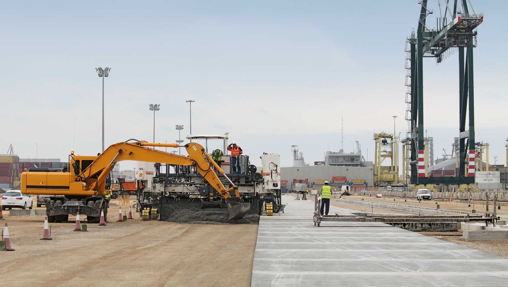Up to four shipping containers are stacked on top of each other in the container terminal at the Port of Valencia. Depending on the container version — there are 20, 40 and 45ft versions — the weight can amount to between 96 and 120t — an immense concentrated load on the areas supporting the containers. Concrete is the material of choice for surfaces bearing heavy loads. And the SP 64i slipform paver is the machine that sets the standards.