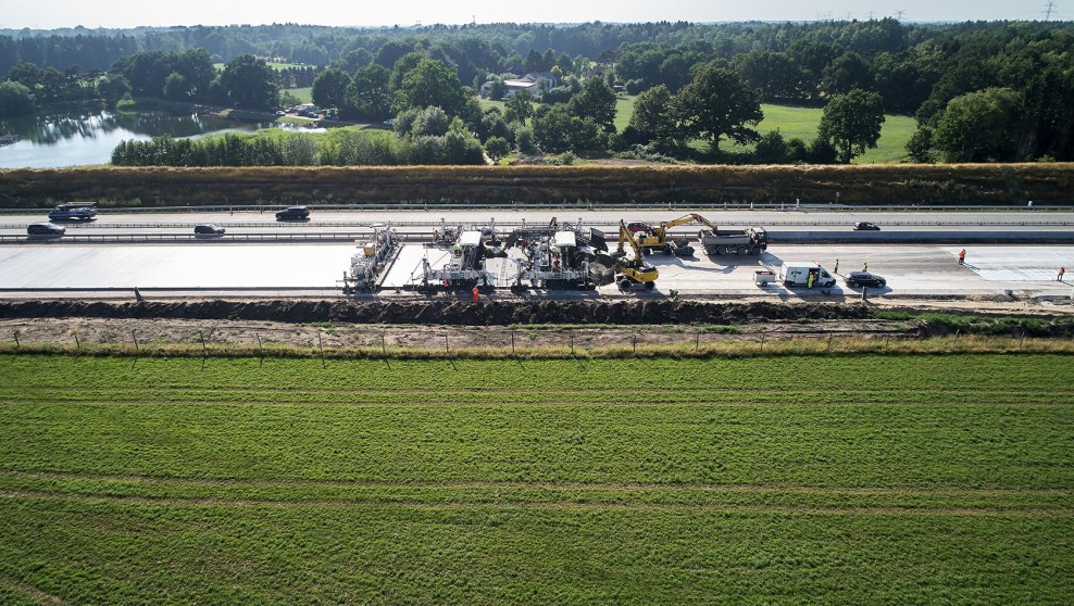The A7 is being widened between Hamburg and Bordesholm from four lanes to six, and in some places to eight, to ensure that the motorway remains an efficient traffic artery. Aiming to create a pavement which would offer a high degree of driving comfort while withstanding the loads of heavy-goods traffic, the motorway consortium Via Solutions Nord and the joint venture ARGE A7 Hamburg-Bordesholm opted for steel reinforced concrete paving with an exposed aggregate concrete surface when widening the 60km stretch located in the Schleswig-Holstein region. BT Beton-Technik GmbH, who were commissioned with the work, have been specialized in concrete pavement construction for many years. Managing Director Mirko Pokrajcic has been relying on technologies and machines from WIRTGEN for just as long: “I insist on 100% quality – and this is precisely what WIRTGEN have been delivering for over 25 years.”