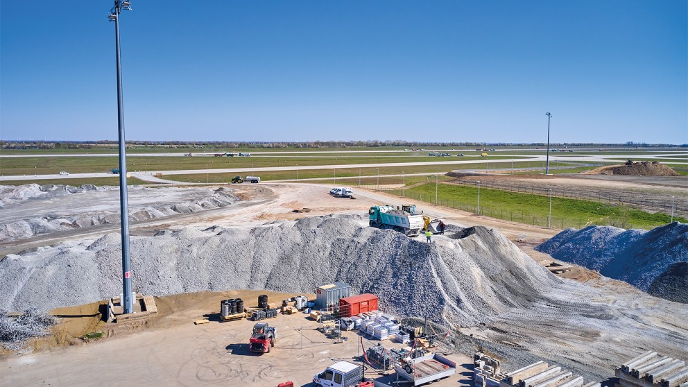 Granulated concrete produced by recycling is a valuable building material that can be fully reused. The 350,000 t of concrete removed during the airport project in Leipzig was temporarily stockpiled close to the project site and completely recycled for use in the subsequent project phases as the base layer for the new runway. Short haulage distances and simultaneously minimal new material requirements enabled low specific diesel fuel consumption and, in turn, a favourable carbon footprint.
