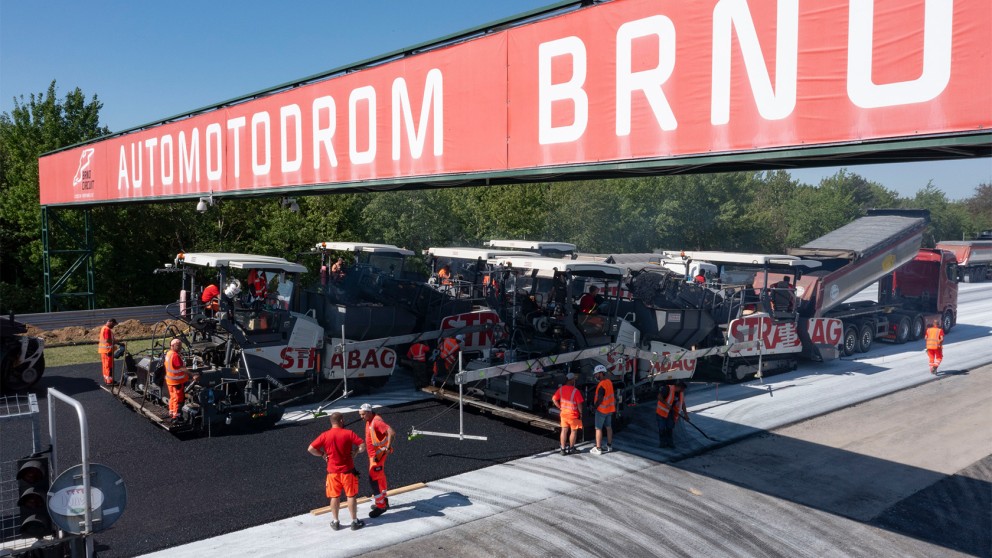International race tracks have particularly stringent requirements for evenness, grip and a homogeneous texture, amongst other factors. Maximum grip and consistent evenness are key – as is the safety of riders travelling at speeds of around 300 km/h. All 5.4 km of the Masaryk Circuit in Brno were resurfaced: Three Vögele pavers and material feeders paved a 2.5 cm-thick level-regulating course and a 4 cm thick surface course across an average width of 15 m – on the Start/Finish straights, this width increased to as much as 17 m.