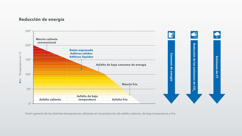 La principal diferencia con respecto al asfalto caliente convencional es la temperatura de procesamiento y extendido. Si lo traducimos a cifras estamos hablando de una reducción de temperatura de 20 - 40°C. Los efectos asociados con la producción y aplicación incluyen, por ejemplo, la mejora del balance energético global y la reducción de las emisiones durante la producción o una menor exposición a componentes nocivos cuando se aplica betún de baja temperatura.