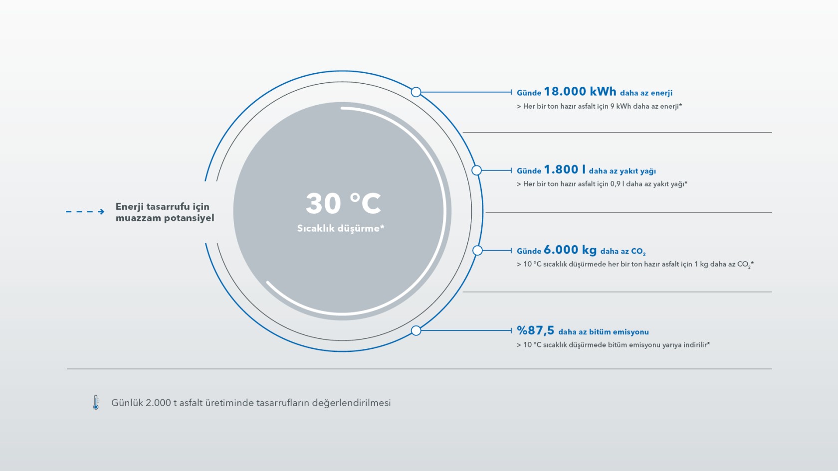 Deutsche Asphaltverband e. V., sıcaklığı düşürülmüş asfalt konulu asfalt kılavuzunda, 30 °C’lik bir sıcaklık düşüşüyle enerji, doğal kaynak ve emisyon bilançosunda ciddi tasarruflar elde edilebileceğini açıklamaktadır.