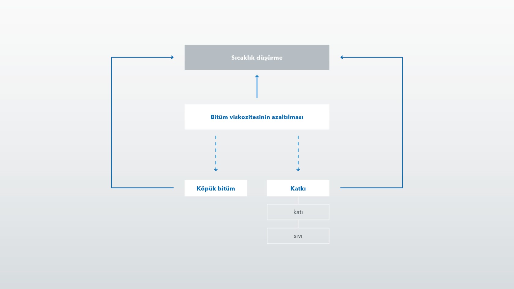 Bitüm ancak yaklaşık 140 °C’lik bir sıcaklıktan itibaren mikserdeki parçacıkları gerçek anlamda sarabilmektedir, bu sıcaklığın altında ise viskoz kalmaktadır. Asfalt üretiminde sıcaklığın düşürülebilmesi için, bitüm viskozitesi geçici olarak düşürülmelidir. Bu işlem, su (köpüklü bitüm) veya katkı maddelerinin eklenmesiyle gerçekleştirilmektedir.